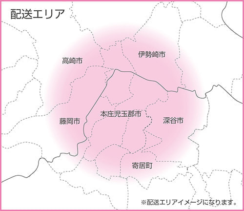 delivery area 配送エリア 本庄市を中心に、児玉郡、岡部、寄居、高崎、伊勢崎、藤岡などにお届けします。(エリア内でもルートによってお届けできない場所もございます。お電話等でご確認ください。)特別なご注文はお気軽にご相談ください。